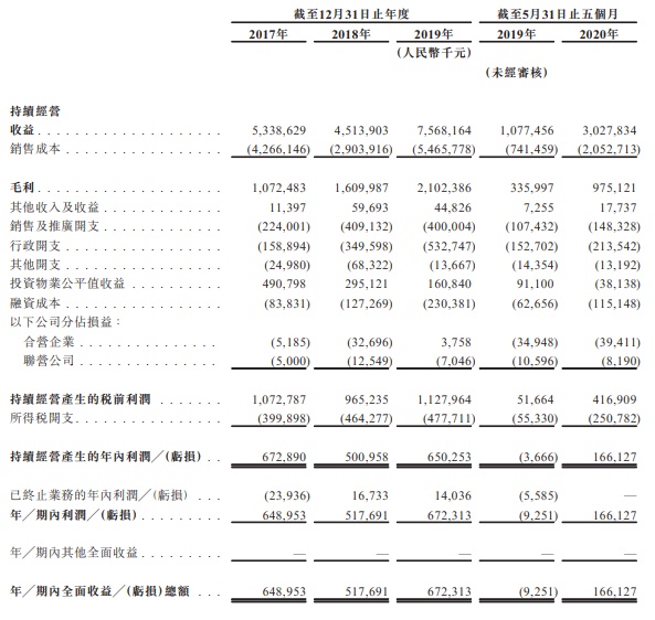 截至2019年和2020年5月31日5个月,公司录得收益为10.77亿元和30.28亿元。2019年前五个月录得亏损为925.1万元,2020年前五个月录得利润为1.66亿元。