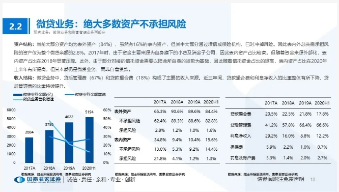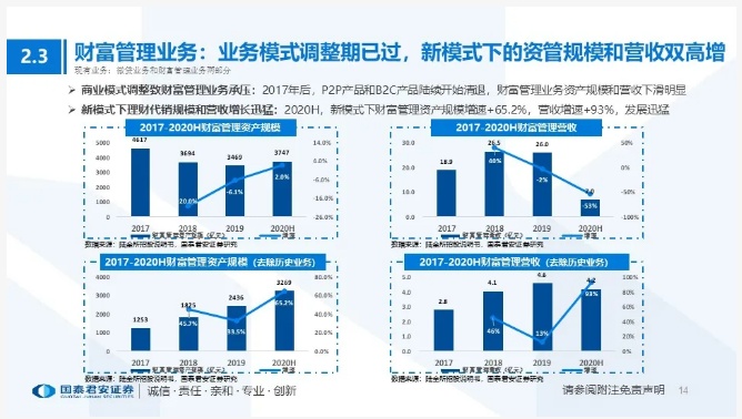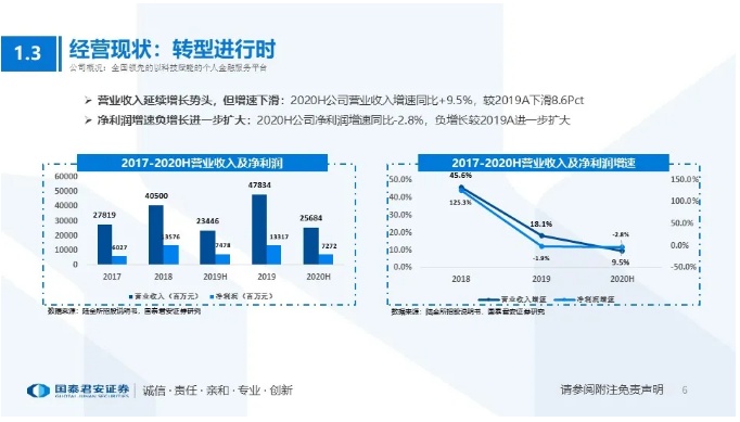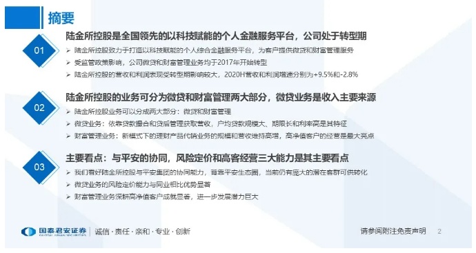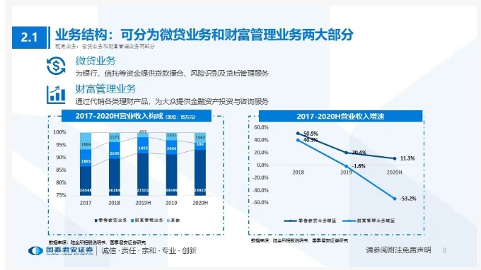 陆金所控股是全国领先的以科技赋能的个人金融服务平台:1)陆金所控股致力于打造以科技赋能的个人综合金融服务平台,为客户提供微贷和财富管理服务;2)受监管政策影响,公司微贷和财富管理业务均于2017年开始转型;3)陆金所控股的营收和利润表现受转型期影响较大,2020H营收和利润增速分别为+9.5%和-2.8%