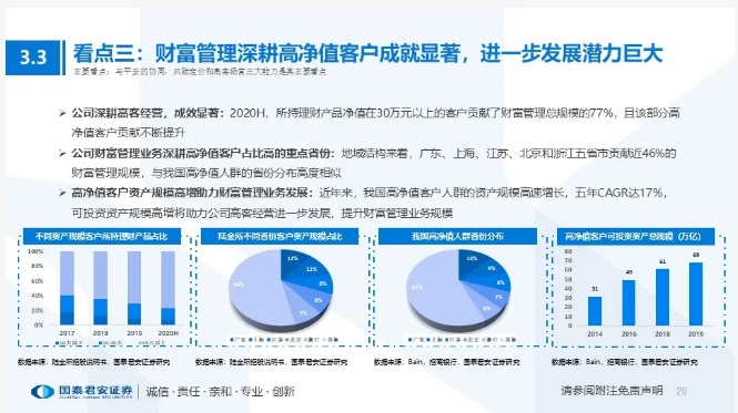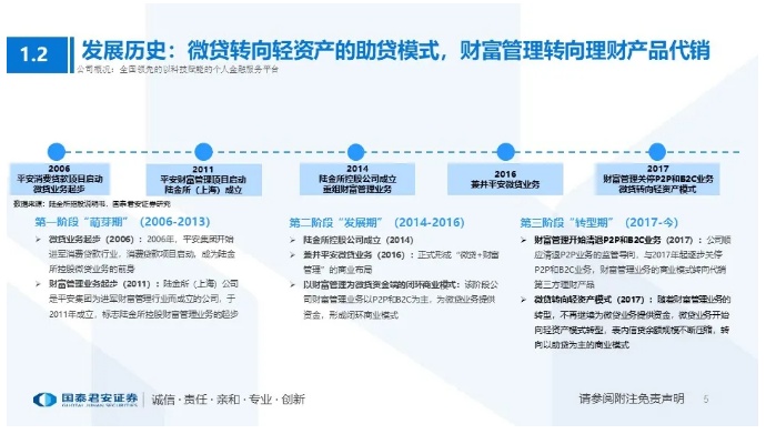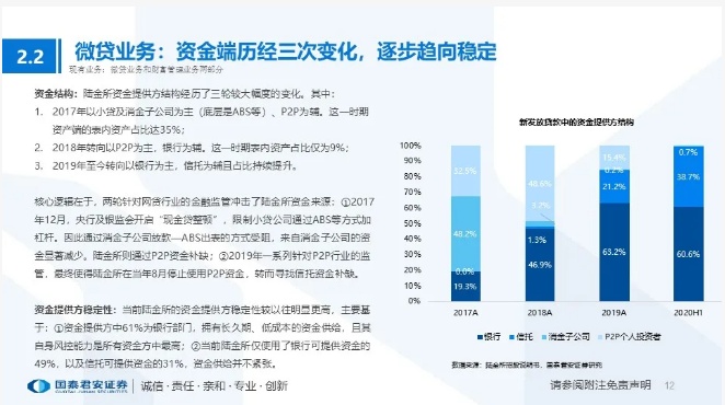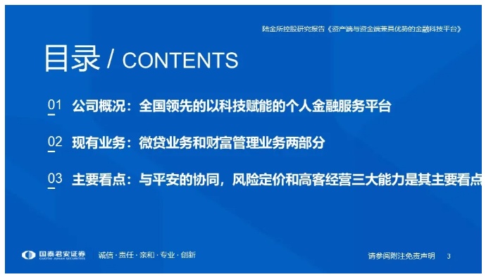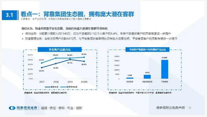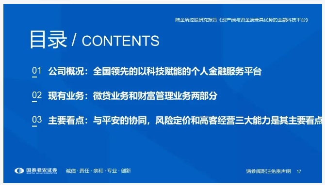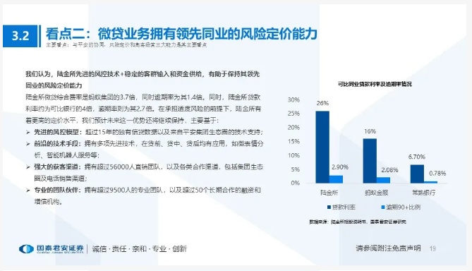 主要看点:与平安集团的协同能力,风险定价能力和高客经营能力是其主要看点。1)我们看好陆金所控股与平安集团的协同能力,背靠平安生态圈,当前仍有庞大的潜在客群可供转化;2)微贷业务的风险定价能力与同业相比优势显著;3)财富管理业务深耕高净值客户成就显著,进一步发展潜力巨大