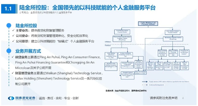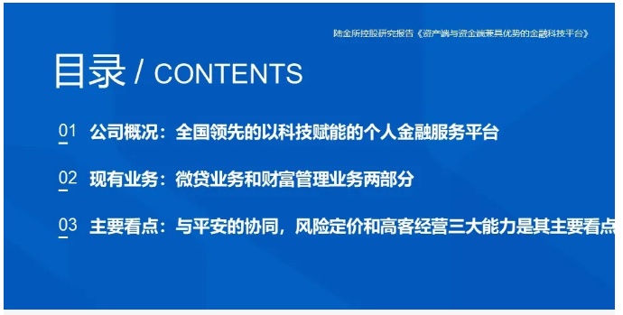 陆金所控股(LU.US)是全国领先的个人金融服务平台,为客户提供微贷和财富管理服务,与平安集团(02318)的协同能力,微贷业务的风险定价能力和财富管理的高客经营能力是其主要看点。