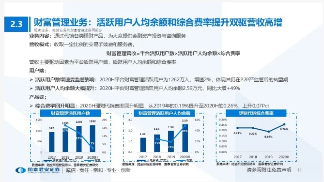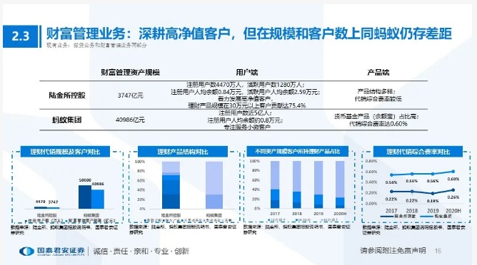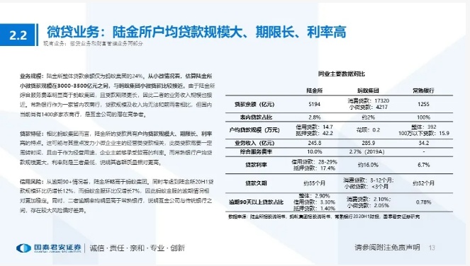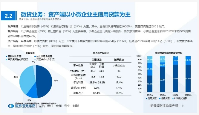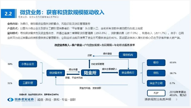 陆金所控股的业务可分为微贷和财富管理两部分,微贷业务是收入主要来源:1)陆金所控股业务可以分成两大部分:微贷和财富管理;2)微贷业务:依靠贷款撮合和贷后管理获取营收,户均贷款规模大、期限长和利率高是其特征;3)财富管理业务:新模式下的理财产品代销业务的规模和营收维持高增,高净值客户的经营是最大亮点