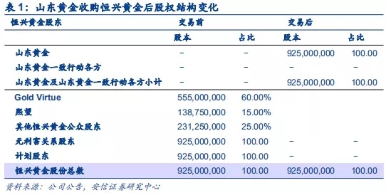 总体来看,恒兴黄金全部已发行股本为9.25亿股,山东黄金拟发行159,482,759股H股并收购恒兴黄金100%股份,即恒兴黄金以1股换得5/29股山东黄金H股新增股份,最终完成恒兴黄金在港股退市,并被山东黄金H股吸收合并。