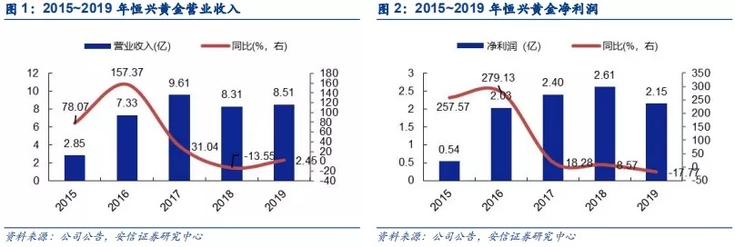 恒兴黄金黄金储量40.93吨,平均品位0.78克/吨,年产矿产金2-3吨,虽品位处于较低水平,但成本控制方面尚可,盈利能力较为稳定。恒兴黄金核心资产是位于新疆的金山金矿采矿权。截至2019年底,公司探明控制+推断口径黄金资源量79.54吨,平均品位0.7克/吨;证实+概率口径黄金储量40.93吨,平均品位0.78克/吨。金山金矿2019年平均入选品位仅0.73g/t,在可比公司中处于较低水平,且低于山东黄金2.8 g/t的平均入选品位。据我们测算,2019年恒兴黄金生产成本位195元/克,高于多数国内黄金公司,但仍优于中金黄金的生产成本,考虑到中金黄金平均入选品位在1.7g/t左右,恒兴黄金在生产成本控制表现尚可,盈利能力较为稳定,2016-2019年税后净利润在2-2.6亿元人民币。