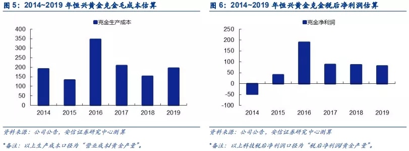 囿于数据可得性,我们对成本数据进行披露的黄金公司进行分析,2019年恒兴黄金生产成本为195元/克,明显高于多数国内黄金公司,但仍优于中金黄金的210元/克的水平。考虑到中金黄金平均入选品位在1.7g/t左右,恒兴黄金在生产成本控制方面仍有一定亮点。
