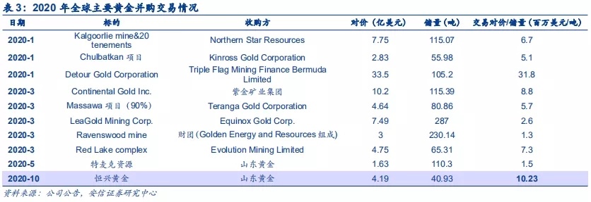 本次收购对价总体公允。从每股价格来看,按2020年10月8日山东黄金20.35港币收盘价算,本次交易恒兴黄金原股东每股价值3.51港元,价值相比恒兴黄金3.81港币收盘价折价8%,但若考虑扣减恒兴黄金特别股息后每股净价3.45港元,则溢价约1.7%。从吨储量交易对价来看,按2020年10月8日山东黄金20.35港币收盘价算,本次交易对价约4.19亿美元,对应单吨黄金储量估值约10.23百万美元/吨。我们的统计数据表明,2020年以来全球主要黄金并购交易的吨储量估值范围大约在1.3-31.8百万美元/吨之间,此次恒兴黄金的吨储量对价处于该范围的较上沿,但考虑到其为成熟矿山,仅略高于2020年3月紫金矿业收购大陆黄金(即将投产阶段)的交易对价8.8百万美元/吨,有一定溢价可以理解。从市盈率角度来看,恒兴黄金仅有17倍左右PE,但山东黄金PE超过40倍,预计收购完成后,山东黄金整体估值将有所降低。