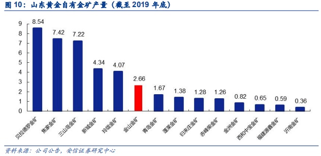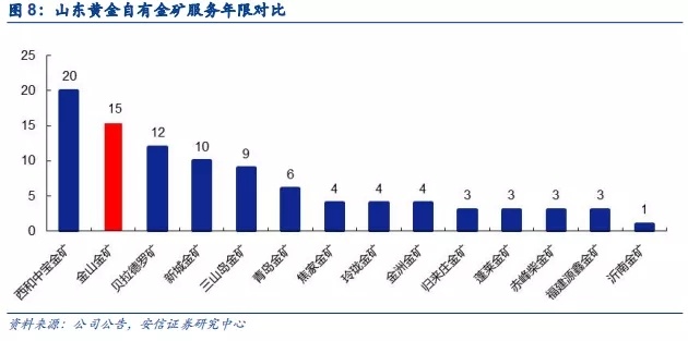 以2019年金山金矿2.66吨产量测算,金山金矿服务年限为15年,居于山东黄金自有矿山第二位。