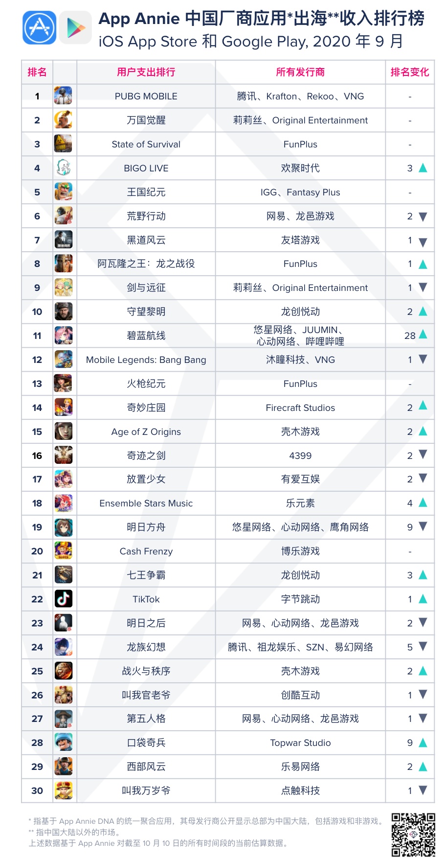 在应用出海收入榜中,二次元团战RPG《碧蓝航线》收入蹿升28位至第11名,成为最大黑马。这主要归功于其9月份日本地区上线三周年的运营活动,收入环比增长345%,这也使其日本市场代理发行商悠星网络海外收入排名上升4位进入前10。同期其中国大陆iOS版(哔哩哔哩(BILI.US)发行)环比增幅也达到291%。