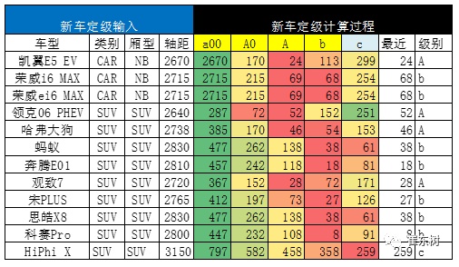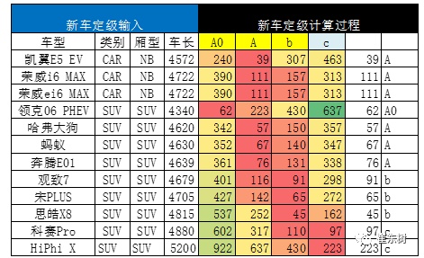 根据每个新车的车长的指标与各级别的标准指标对比,寻找车长差距最小的指标,根据车长的定级看,各车型有些定级参考,大部分测算分级基本符合直觉定位预期。