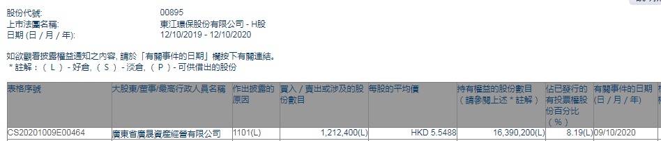 智通财经APP获悉,香港联交所最新资料显示,10月9日,广东省广晟资产经营有限公司增持东江环保(00895)121.24万股,每股作价5.5488港元,总金额约为672.74万港元。增持后最新持股数目约为1639.02万股,最新持股比例为8.19%。