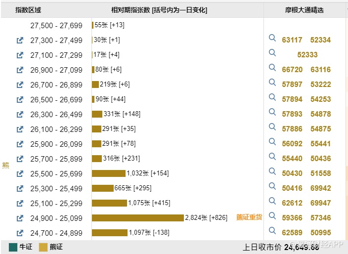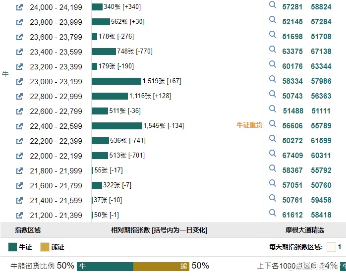 智通财经APP获悉,截至10月12日,恒指最新的牛熊街货比例50:50。摩根恒指牛熊证街货分布图中的数据显示,熊证街货重货区在24900-25099区间,该区间最新熊证数量为2824张,较上一交易日增加826张;最多新增也在该区域。牛证街货重货区在22400-22599区间,该区间最新牛证数量为1545张,较上一交易日减少134张;最多新增在24000-24199区间,该区间最新牛证数量为340张,较上一交易日增加340张。