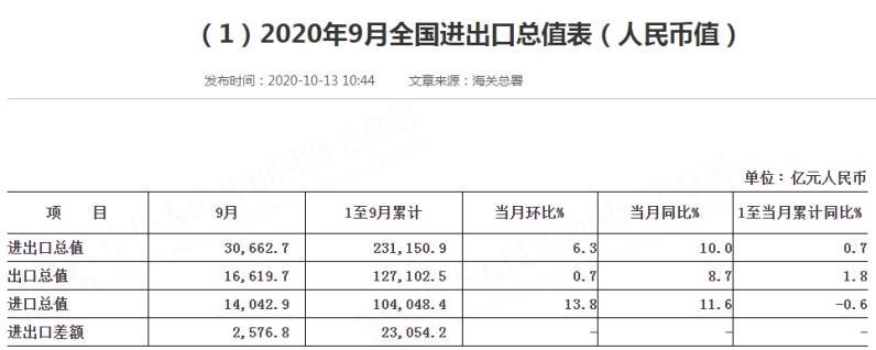 智通财经APP获悉,海关总署网站10月13日信息显示,中国9月(以人民币计)进出口总值30662.7亿元,同比增10%,出口总值16619.7亿元,同比增8.7%,前值增11.6%;进口总值14042.9亿元,同比增11.6%,前值降0.5%;贸易顺差2576.8亿元。