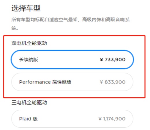 此外,据特斯拉美国官网披露,特斯拉Model S长续航版和高性能版均降价0.3万美元,当前起售价分别为6.649万美元和8.649万美元。
