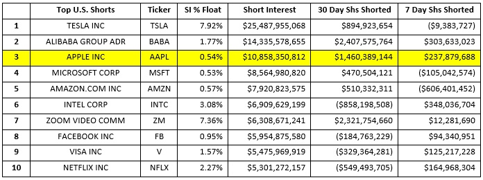 据数据显示,目前苹果空头头寸为108.6亿美元,做空股数为9280万股,占其总流通股数的0.54%,苹果的股票借贷手续费为0.4%。据悉,目前苹果是美国市场做空规模第三大的股票,仅次于特斯拉(TSLA.US)和阿里巴巴(BABA.US)。