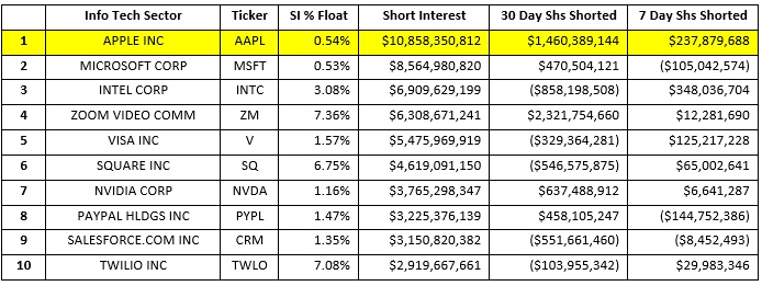 此外,在美国IT行业中,苹果则为该行业中做空规模最大的股票:
