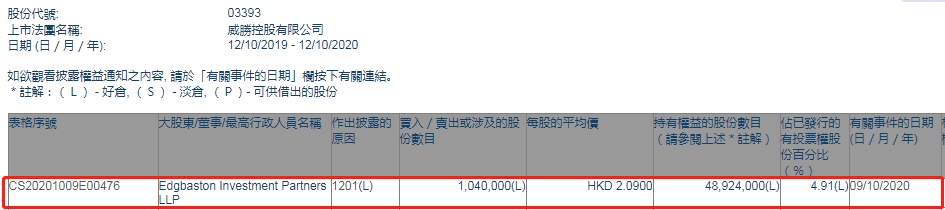 智通财经APP获悉,香港联交所最新资料显示,10月9日,Edgbaston Investment Partners LLP减持威胜控股(03393)104万股,每股作价2.09港元,总金额约为217.36万港元。减持后最新持股数目约为4892.4万股,最新持股比例为4.91%。