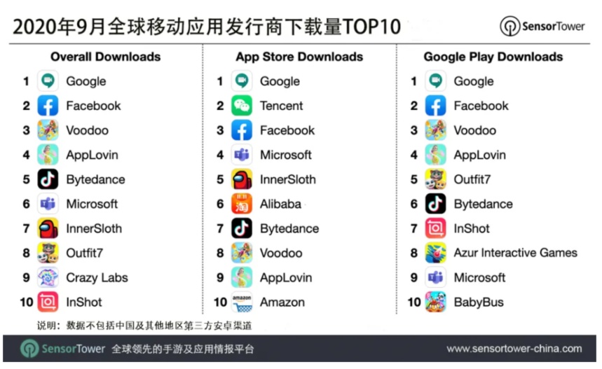 以下为9月全球移动应用发行商下载量Top10完整榜单: