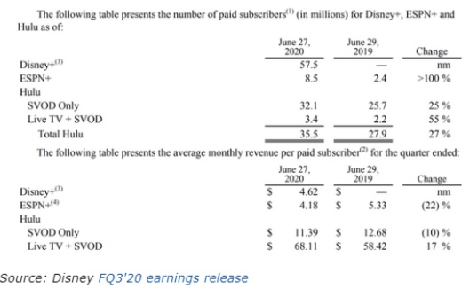 在2020年第三财度,Disney+用户激增至5750万,但平均月费仅为4.62美元。该公司每月仅从SVOD服务中获得2.66亿美元的营收,同时还为消费者提供了该公司所有内容的访问权限。相比之下,在公共卫生事件爆发前,迪士尼单部电影的单月营收就超过了这些业务营收。