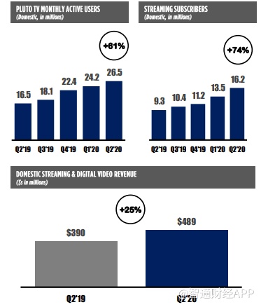 ViacomCBS第二季度财报显示,流媒体和数字视频业务收入4.89亿美元,同比增长25%;付费用户达1620万人,同比增长74%;月活跃用户量(MAU)达2650万,同比增长61%。
