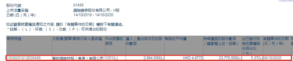 智通财经APP获悉,香港联交所最新资料显示,10月8日,东航国际控股(香港)有限公司减持国联证券(01456)299.45万股,每股作价4.8772港元,总金额约为1460.5万港元。减持后最新持股数目约为2377.55万股,最新持股比例为5.37%。