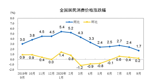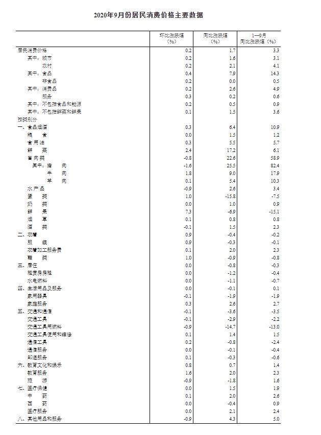 智通财经APP获悉,据国家统计局10月15日公布,2020年9月份,全国居民消费价格同比上涨1.7%。其中,城市上涨1.6%,农村上涨2.1%;食品价格上涨7.9%,非食品价格持平;消费品价格上涨2.6%,服务价格上涨0.2%。1—9月,全国居民消费价格比去年同期上涨3.3%。