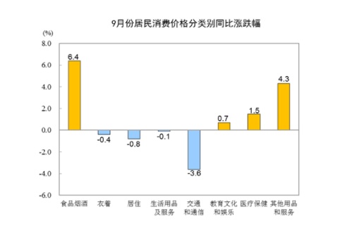 9月份,食品烟酒类价格同比上涨6.4%,影响CPI(居民消费价格指数)上涨约2.00个百分点。食品中,畜肉类价格上涨22.6%,影响CPI上涨约1.39个百分点,其中猪肉价格上涨25.5%,影响CPI上涨约1.00个百分点;鲜菜价格上涨17.2%,影响CPI上涨约0.41个百分点;水产品价格上涨2.6%,影响CPI上涨约0.05个百分点;粮食价格上涨1.5%,影响CPI上涨约0.03个百分点;蛋类价格下降15.8%,影响CPI下降约0.11个百分点;鲜果价格下降6.9%,影响CPI下降约0.12个百分点。