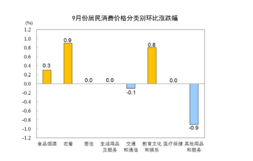 9月份,全国居民消费价格环比上涨0.2%。其中,城市上涨0.2%,农村上涨0.2%;食品价格上涨0.4%,非食品价格上涨0.2%;消费品价格上涨0.2%,服务价格上涨0.3%。