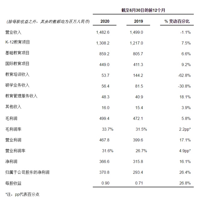 营业收入为人民币14.826亿元(2.098亿美元),较去年同期的人民币14.990亿元略减1.1%。其中来自K-12教育服务的收入从人民币12.170亿元增长7.5%至人民币13.082亿元(1.852亿美元)。
