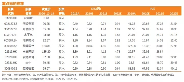 下游品牌端:【波司登】(03998)【李宁】(02331)【安踏体育】(02020)【南极电商】【开润股份】【太平鸟】【稳健医疗】。