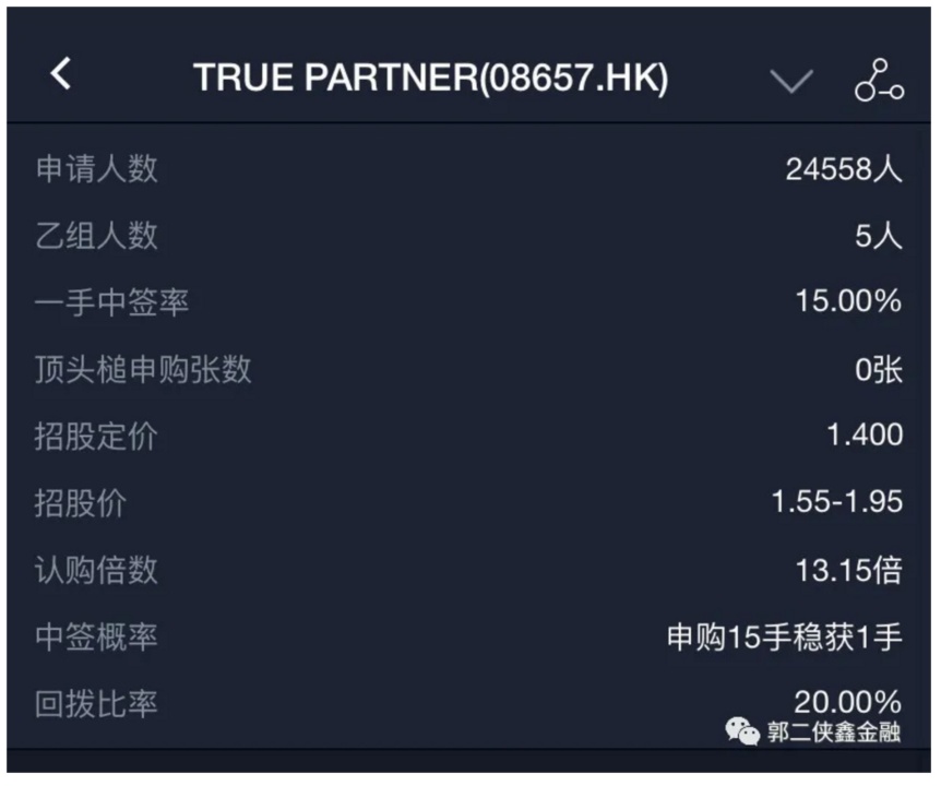 认购人数24558人,最终超额认购13.15倍,无顶头槌,回拨20%,一手中签率15%,申购15手稳中一手。本次招股价区间为1.55-1.95港元,最终以超下限定价1.4港元,每手2800港元。
