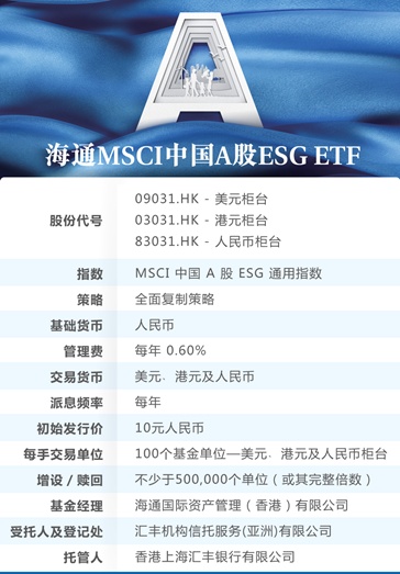 智通财经APP获悉,海通国际(00665)旗下资产管理今天推出首支在香港交易所(“港交所”)上市的宽基ESG ETF—海通MSCI中国A股ESG ETF(03031)。该产品也是目前香港唯一一支提供关于中国A股ESG(“环境、社会和管治”)广泛投资机会的ETF产品。