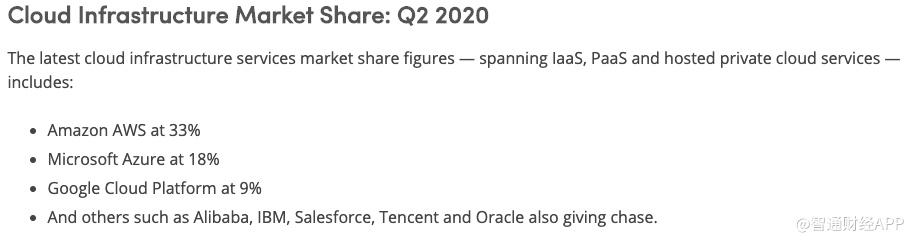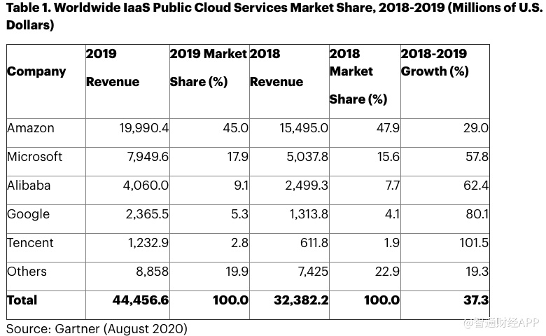 通过上面的表格,会发现AWS在2018-2019年期间的增长速度是所有顶级公共云服务提供商中最慢的——为29%,而微软为58%,谷歌为80%。