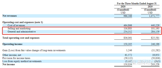 数据显示,截至今年8月31日的三个月内,公司市场销售费用为1.17亿美元,同比增长13.4%,占当期公司总经营费用的31.5%,上年同期该数据为26.3%。