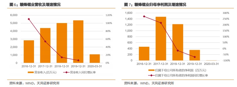 营收方面,自2017年达到54.12%的营收增速后,其营收增速逐年放缓,至2019年其实现营收为53.42亿元,同比增长6.75%;而利润方面则出现了不断下滑的情况,该公司归母净利润在2017年达到顶点之后亿开始下滑,2019年归母净利润同比下跌70.73%至3.58亿元,主因公司2019年计提3.95亿的公允价值变动损失和碳酸锂及氢氧化锂价格下降导致。