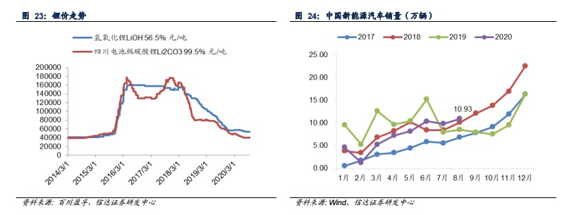 而随着国内新能源汽车销量的逐步恢复,锂盐企业库存田野持续去化,锂盐厂议价能力不断提升,在此情况下,企业通过提价扭转亏损局面的意愿强烈,9月底碳酸锂价格有所反弹,因此信达证券认为碳酸锂价格反弹短期可持续,反弹至5-6万元是比较合理且上下游企业均可接受的水平。同时,终端需求快速增长之势,也将有效支撑高端氢氧化锂价格。
