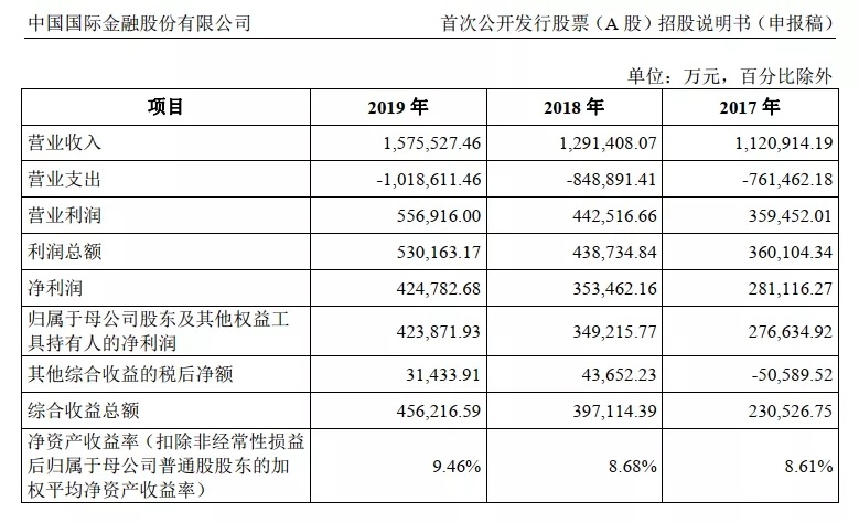 据了解,中金公司自2015年H股上市以来,业务布局日益均衡,营业收入及净利润均保持稳健增长。据招股书披露,中金公司的经营业绩在近三年持续增长。其中,2019年,公司实现营业收入157.55亿元,同比增长22%,实现归母净利润42.39亿元,同比增长21.38%。