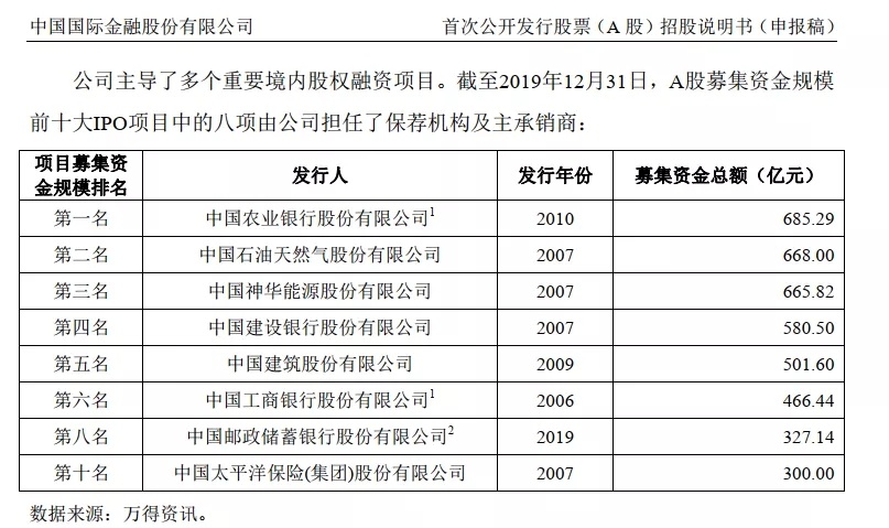 截至2019年末,A股募集资金规模前十大IPO项目中,八项由中金公司担任了保荐机构及主承销商。