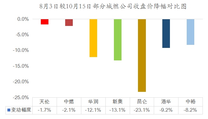 智通财经APP获悉,天伦燃气(01600)近期在港股上市的规模以上城燃板块中,股价表现相当稳健。尽管受外围环境、疫情拖累、大市扰动等因素影响,燃气板块出现阶段性下行,但天伦燃气因业绩支撑及经营表现为投资者带来信心,整体市值表现可圈可点。由Wind数据库整理的部分规模以上城燃公司8月3日及10月15日的收盘价显示,多数城燃公司受行业下行压力影响,股价下跌幅度明显,降幅区间集中在8%-23%,但天伦燃气股价较8月初仅微降1.7%,远优于行业平均水平。