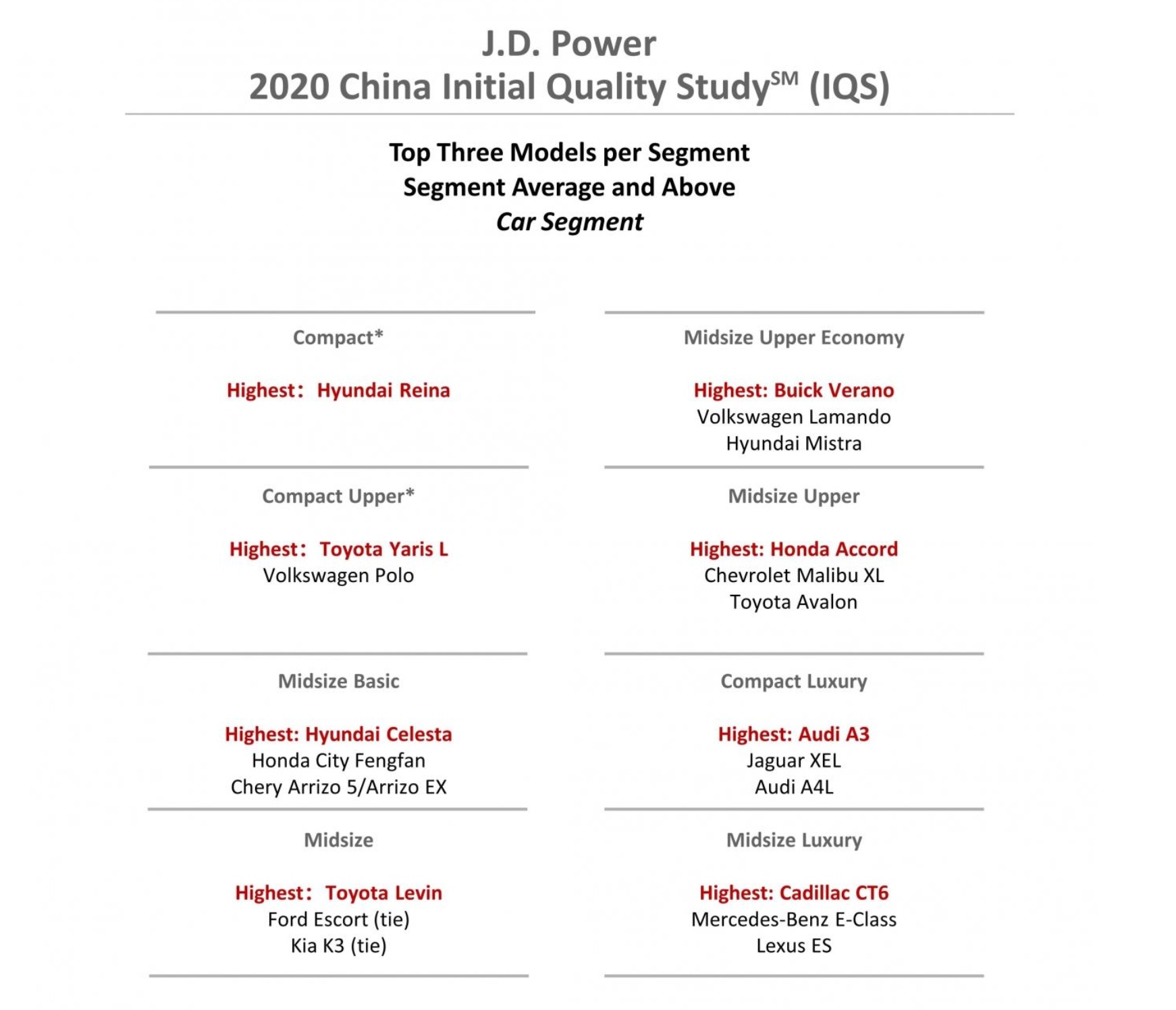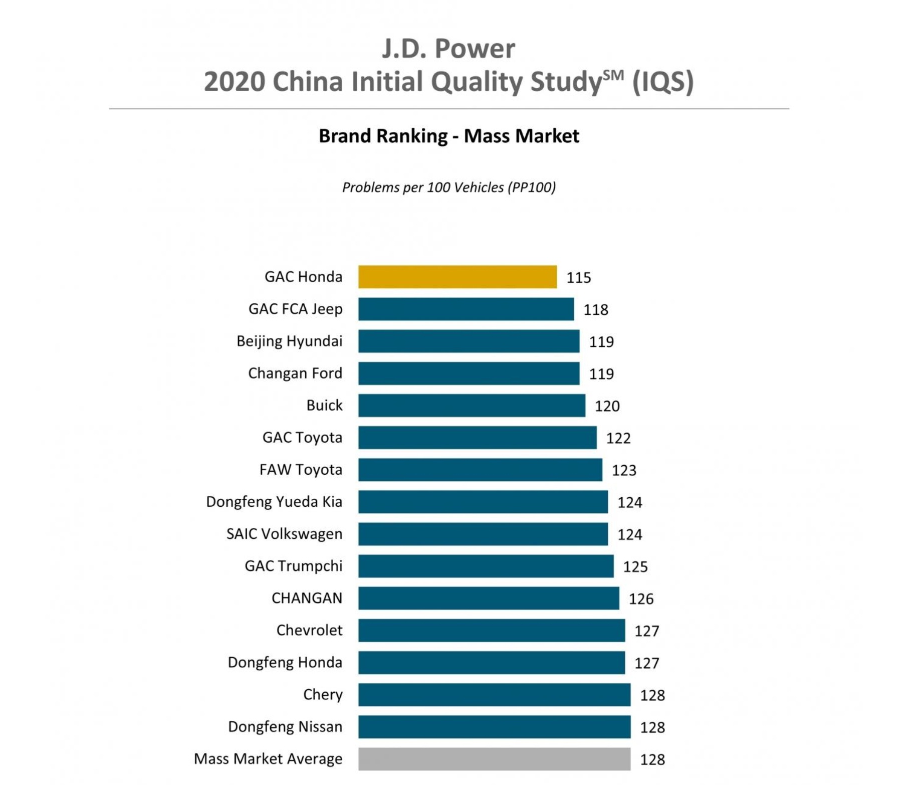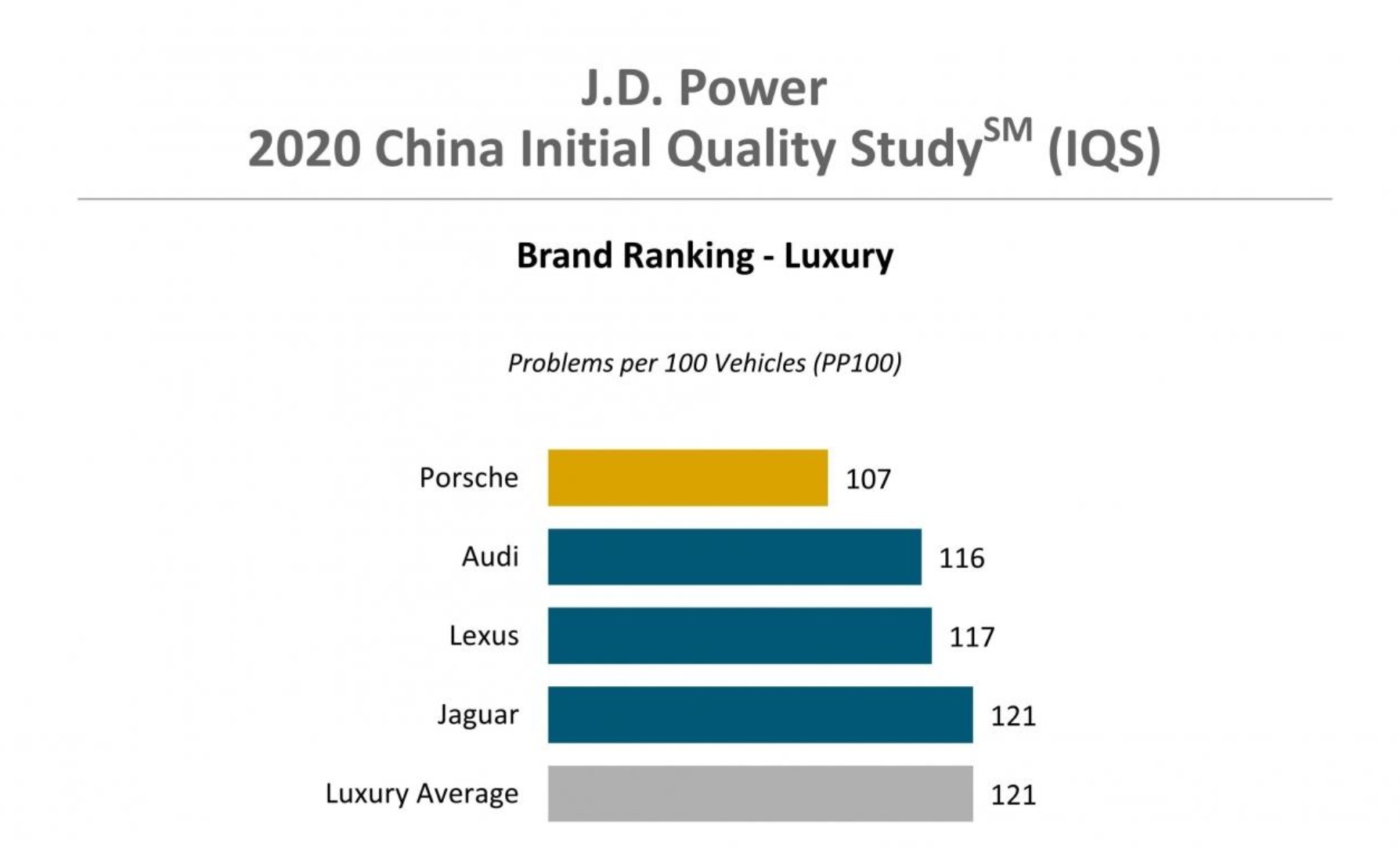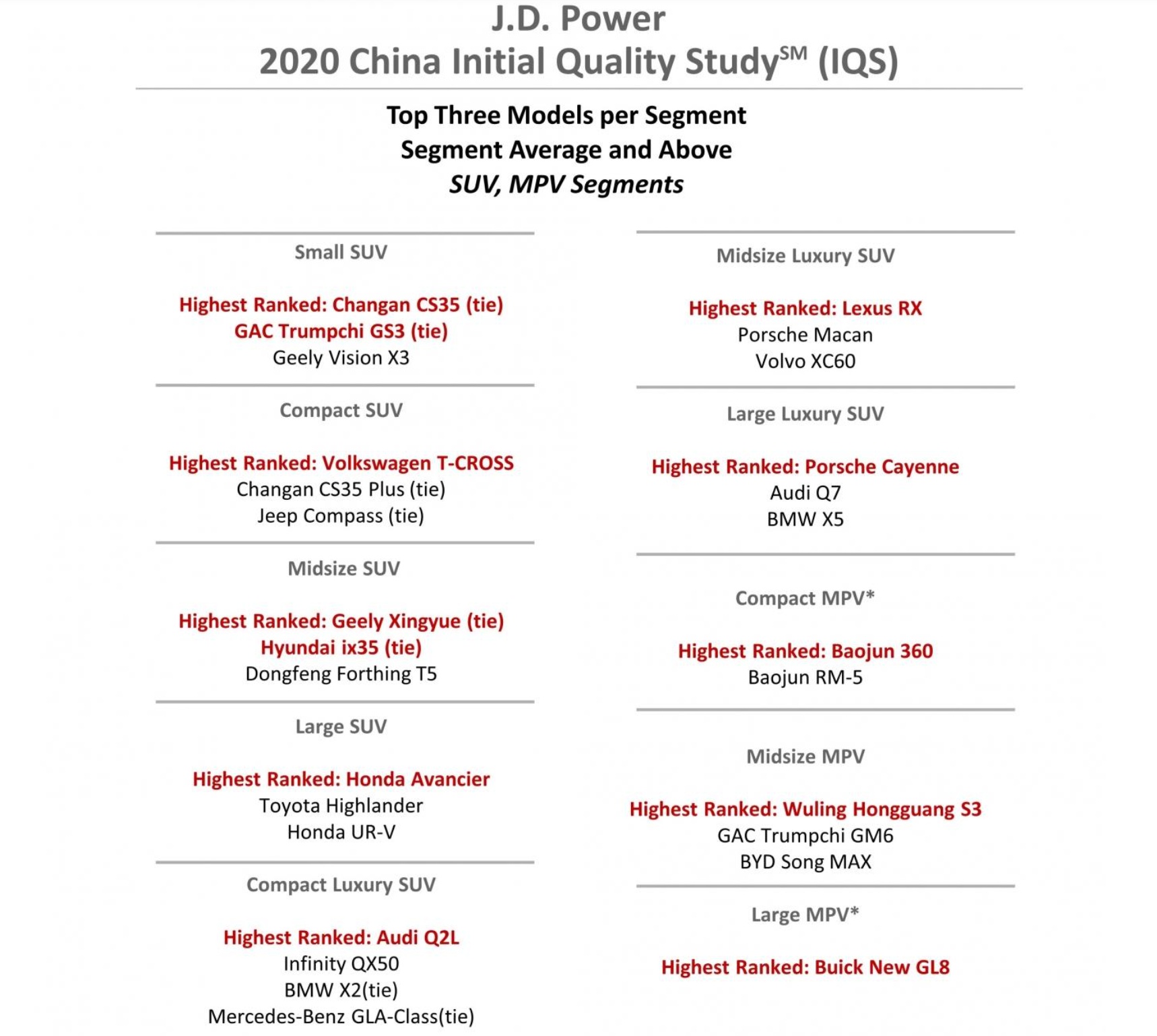 J.D. Power新车质量研究重点考察拥车期为2-6个月的新车车主遇到的质量问题。新车质量得分体现为平均每百辆车问题数(PP100),分数越低代表新车问题数越少、质量越高。