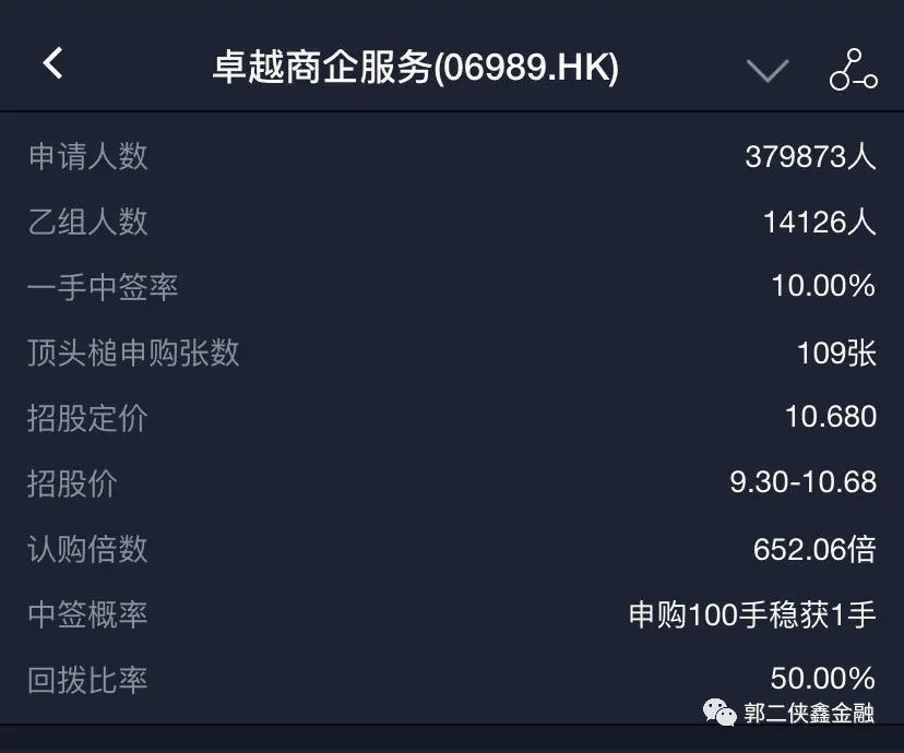 申购人数379873人,最终超额认购652.06倍,回拨50%,顶头槌109张,一手中签率10%,申购100手稳中一手。本次招股价区间为9.3-10.68港元,最终以上限定价10.68港元,每手10680港元。