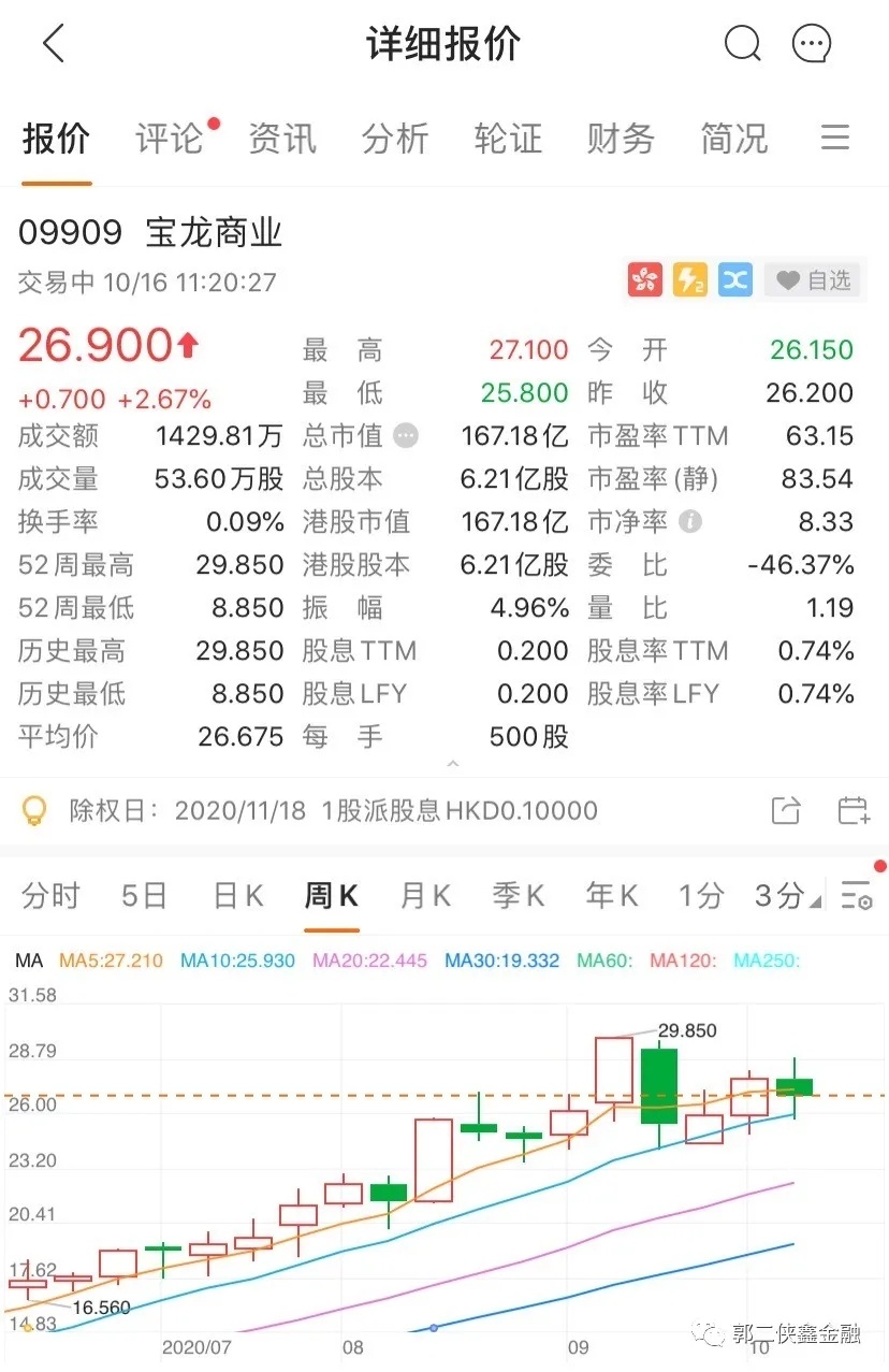 在操作上:卓越商企各方面相比宝龙商业都更优秀,理应获得相应的估值,不过考虑到宝龙地产是上市后慢慢涨起来的,经过资本市场的检验,卓越商企不可能一步到位,涨幅超过40%,就可以出货了。