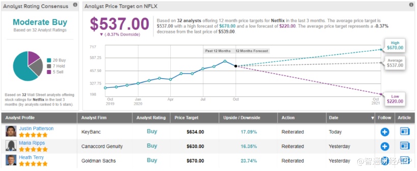 基于华尔街有20位分析师给予该股“买入”评级,7位给予“持有”评级,5位给予“卖出”评级,市场共识为“适度买入”评级。显然,华尔街认为Netflix需要一个冷却期,因为537美元的平均目标价意味着1%的下跌潜力。