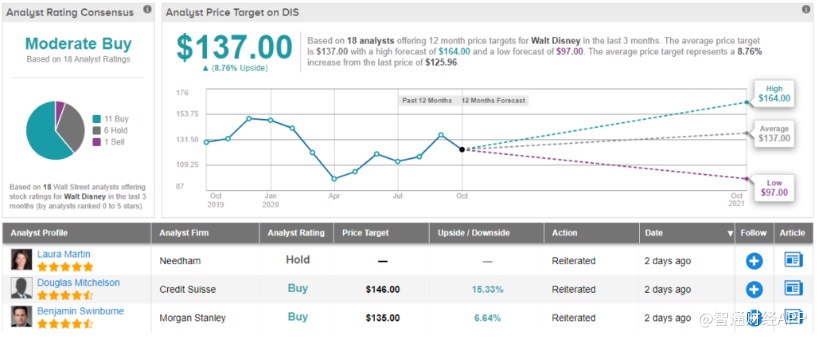 “我们仍然相信管理层可能会提前给出迪士尼+取得盈亏平衡的业绩指引,因为这项服务的订户数量已经超过了其5年目标的最低值。”Quadrani对迪士尼+的“强劲增长”感到“印象深刻”,他认为投资者应该“继续关注迪士尼异常增长的数字订户和优秀的内容”。
