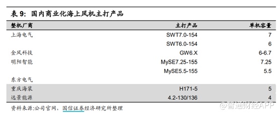 由于机组大型化是全行业公认的度电成本下降的核心路径,因此国内风机厂商的竞争必然离不开对大容量机组的布局速度。目前只有具备 6MW 以上海上风机产品的整机厂商,才能够继续保持国内市场领先地位。由下表可见,目前已经将主打产品布局在 6MW 以上级别的整机厂商只有上海电气(601727)、金风科技、明阳智能(601615)、东方电气等。而重庆海装和远景能源的主力海上产品暂时停留在 4-5MW 区间。目前各家整机厂商已经将新机型开发重点落在 8-10MW 区间,未来我国海上风电的机组大型化进程将呈现加速趋势。