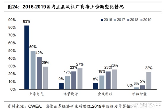 虽然从目前市场份额来看,我国海上风电整机厂主要由四个厂商瓜分,分别是上海电气、远景能源、金风科技和明阳智能的占比分别为29%、27%、26%和22%。