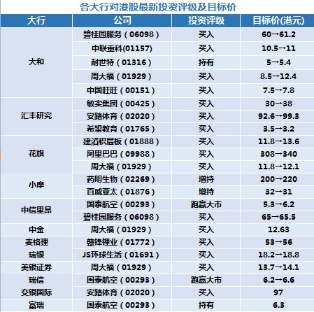 四、各大行对其他港股最新投资评级及目标价