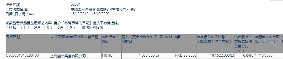智通财经APP获悉,香港联交所最新资料显示,10月14日,上海国际集团有限公司增持中国太保(02601)162.6万股,每股作价23.25港元,总金额约为3780.45万港元。增持后最新持股数目约为1.68亿股,最新持股比例为6.04%。
