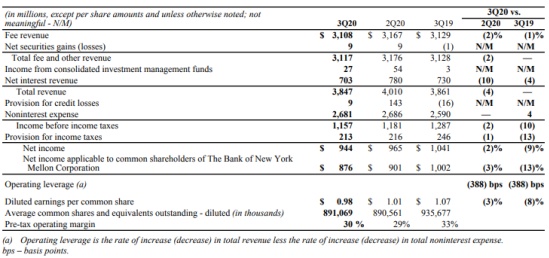 智通财经APP获悉,10月16日(周五)美股盘前,纽约梅隆银行(BK.US)公布了2020年第三季度业绩。