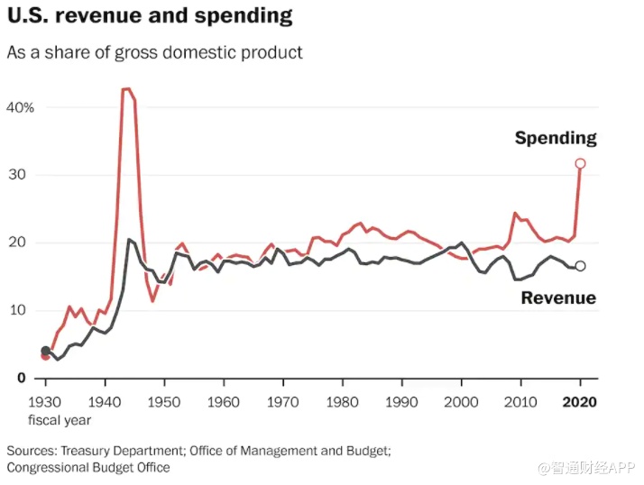 数据显示,2020年,美国政府的支出为6.552万亿美元,高于一年前的4.447万亿美元;税收收入为3.42万亿美元,比2019年略有下降。