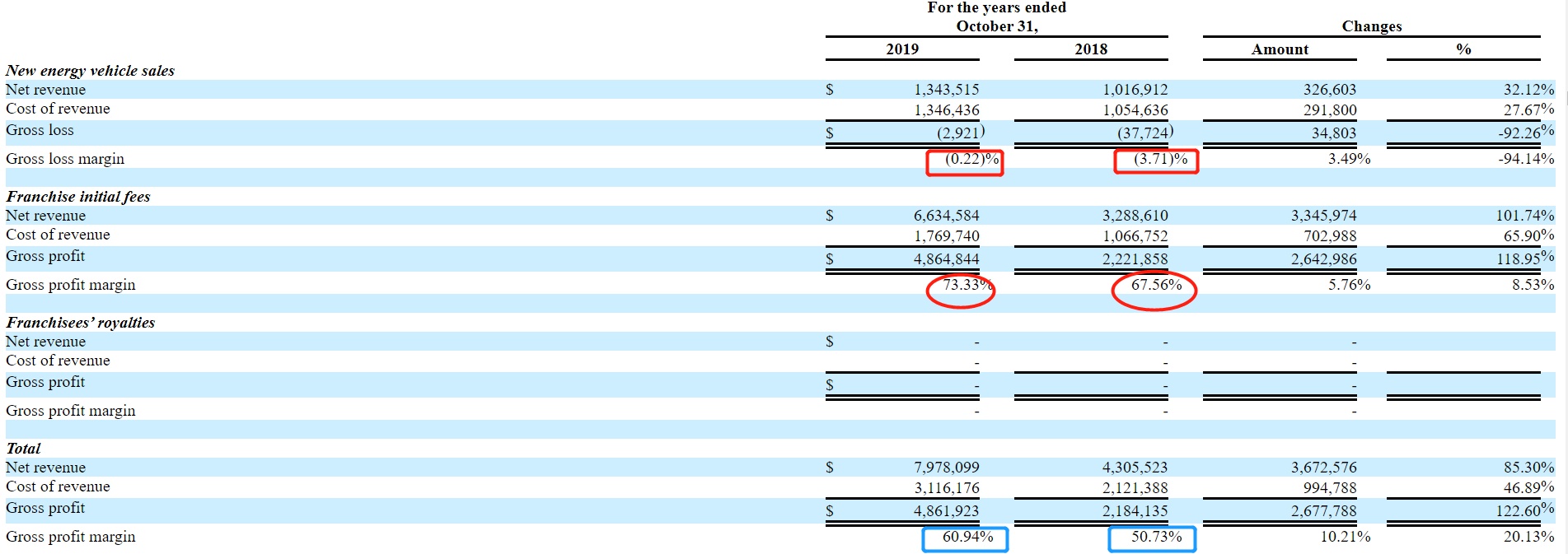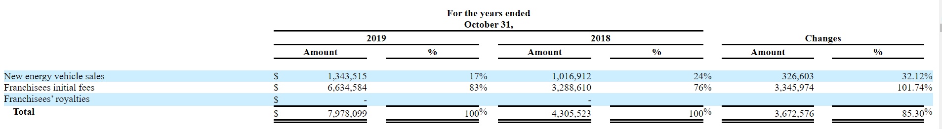 不过,这并未妨碍九紫新能业绩的快速增长。2019财年时,其收入为797.81万美元,同比增速高达85.3%。其中,新能源汽车销售收入为134.35万美元,同比增长32.12%;而加盟费收入为663.46万美元,同比增长101.74%,该增长主要是因为加盟商的数量从2018财年的21家增加至30家。在加盟费收入同比翻倍后,该业务2019财年时占总收入的比例升至83%,较2018财年提升7个百分点。