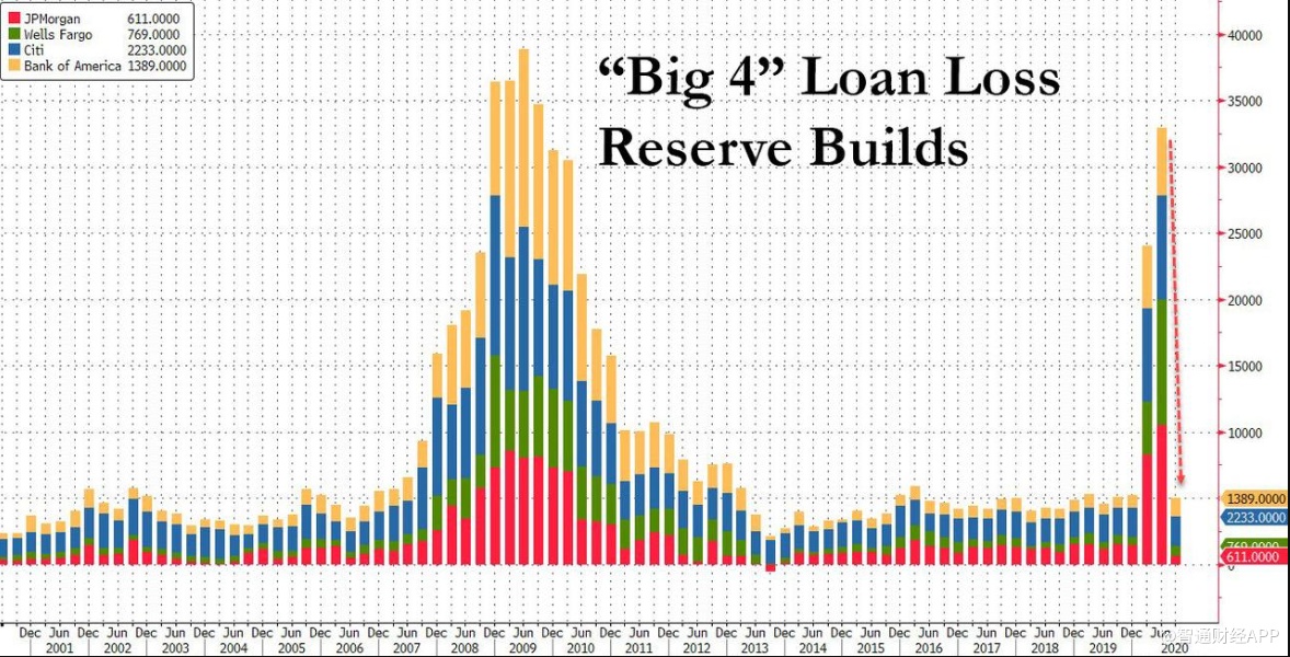 智通财经APP获悉,上周美国大型银行已经公布了最新季报,最引人注目的是贷款损失准备金从第二季的330亿美元锐减至9月30日的仅50亿美元。